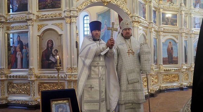 которому сослужили благочинный Миасского округа протоиерей Георгий Крецу, настоятель храма Архангела Михаила протоиерей Виталий Жулин и другие клирики.